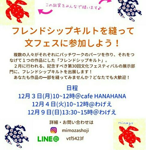 八丈島で2月に行われる『八丈島文化フェスティバル』、通称文フェス。 2年前から展示部門に刺繍作品などを出展してきました。 来年は記念すべき第30回の年なので、たくさんの方に関わっていただき、一緒に作品を仕上げてみたいなと思いまして… フレンドシッ…